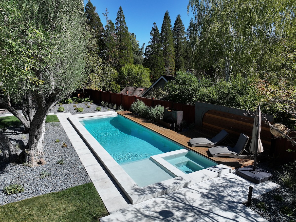 Tahoe Coast Polished Pool Finish combines ivory-toned pebbles and blue, green, and red glass along with our mix of ocean shells.