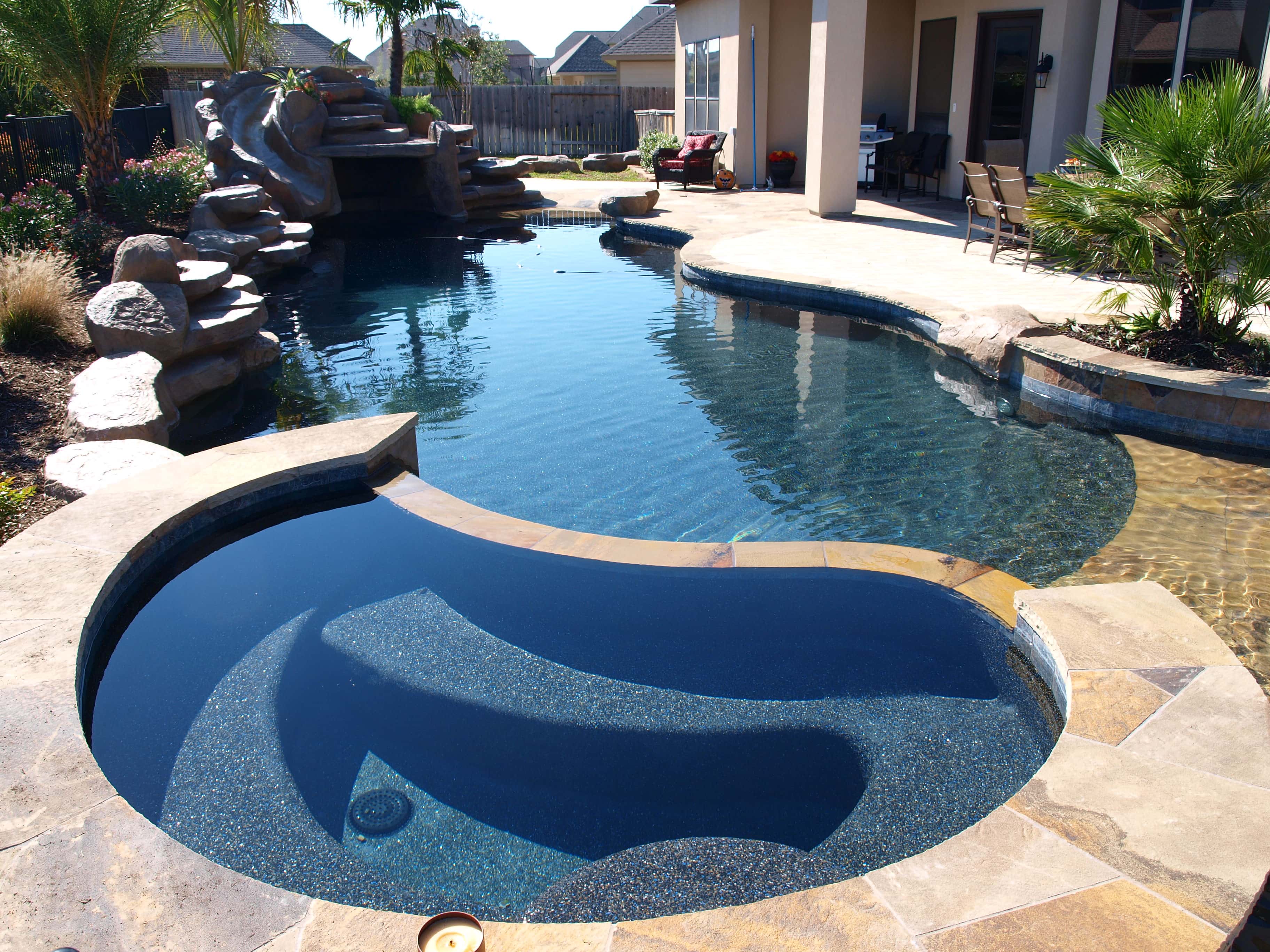 *The water color hue cast by black bottom pools can be either blue or green. Because of the intense color they are highly influenced by the surroundings and sunlight. In most cases black bottoms in low light will tend to reflect more blue. In full sunlight they tend to be on the green side. The water color graphics are designed to illustrate what you can expect the hue to be for a particular finish in most cases. The bracket on the graphic is an indication of the intensity level within a wide range of possible hues for a particular finish. Water color is subjective and will be unique to the pool and its surroundings.*